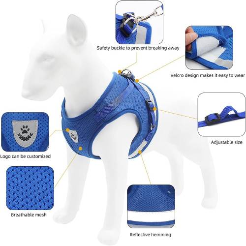 Az állítható fényvisszaverő öv és póráz puha, kényelmes és légáteresztő hálós szövetkialakítással rendelkezik, amely fokozza kedvence viselési élményét.