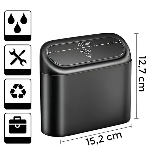 Ez a kompakt szemeteskosár tisztán és rendezetten tartja járművét anélkül, hogy túl sok helyet foglalna. Kialakítása bőséges kapacitást kínál a napi hulladék számára, így praktikus és nem feltűnő.