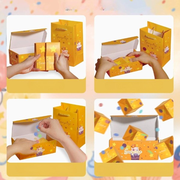 Kinyitáskor a doboz kirobban, és több réteg meglepetésekkel teli rekeszt tár fel. Ez egy olyan ajándék, amely folyamatosan meglep, és minden egyes réteggel újabb és újabb élvezeteket kínál.