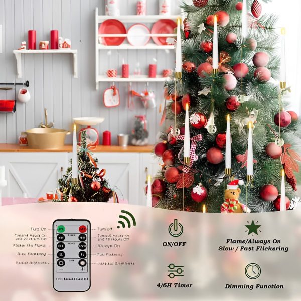 A 10 gombos távirányítóval szabályozhatja a gyertyák fényerejét, választhat a négy fényüzemmód közül, valamint beállíthat 4 vagy 6 órás időzítőt, így a díszítés egyszerű és rugalmas.