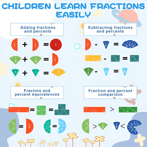 9 színes mágneses kört és téglalapot tartalmaz, amelyek megkönnyítik a törtek szemléltetését és megértését.