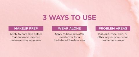 - ALAPOZÓ ARCRA ÉS A SZEM ALATTI RÉSZRE: Vigye fel a bőrére elsőként vagy hidratáló krém felszívódása után. Masszírozza el a szem alatti részen a finom vonalak elsimításáért, az orrán és az arcán a pórusok és a foltok megjelenésének minimalizálásáért, és a t-zónában a matt hatásért